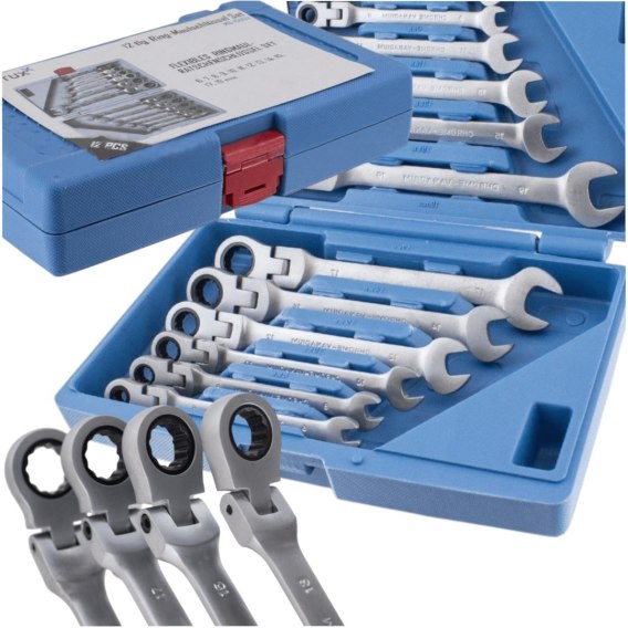 Zestaw Kluczy Płasko-Oczkowych z Przegubem - 12 elementów, stal chromowo-wanadowa, przeguby dla wygody, 72 zęby i odchylenie 5°. Solidne narzędzia w praktycznym niebieskim pudełku.
