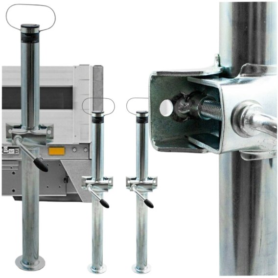 Kompletne i uniwersalne rozwiązanie - zestaw 2 podpór z obejmą pasuje do większości lawet, przyczep towarowych, kempingowych i transportowych, oferując szybki i prosty montaż.