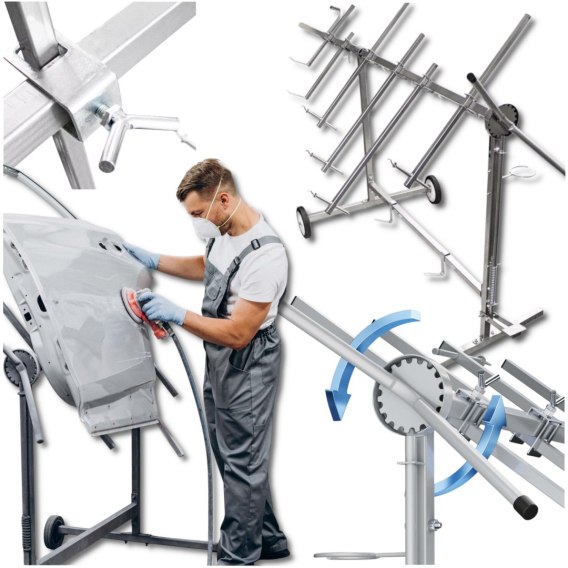 Obrotowy stojak lakierniczy to funkcjonalne narzędzie, które sprawdzi się w pracy z maskami, drzwiami, zderzakami, a nawet mniejszymi elementami, takimi jak lusterka czy felgi.