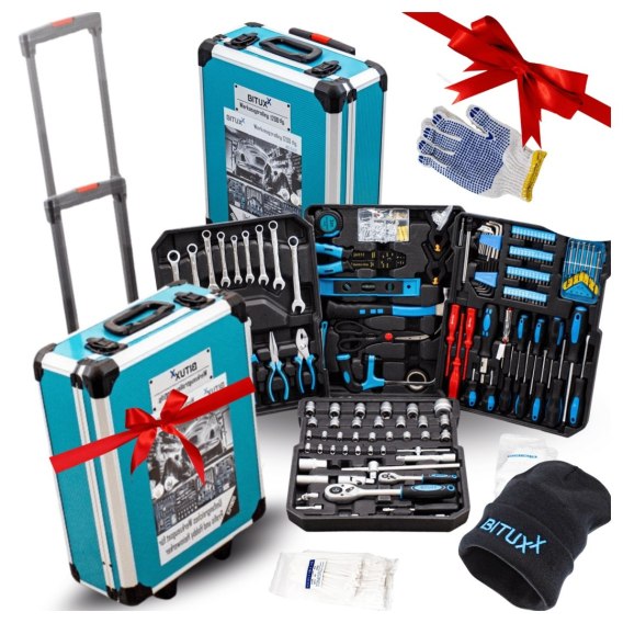 🔩 Zawartość: 1200 elementów (szczypce, klucze, nasadki, bity, śrubokręty, akcesoria mocujące, opaski kablowe, poziomica, taśma miernicza, piła, nożyczki, rękawiczki)