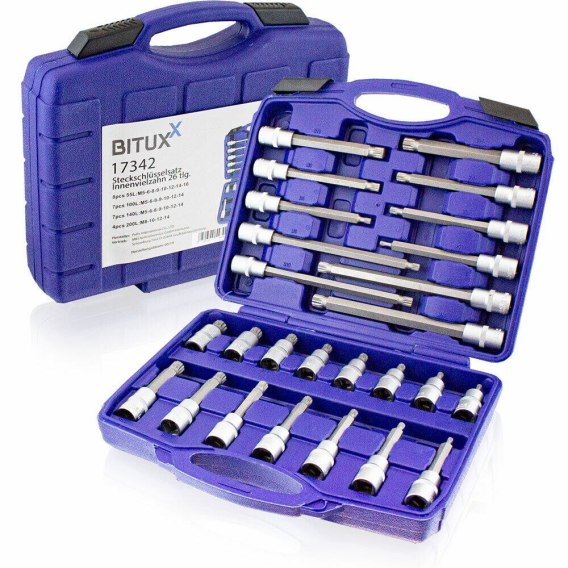 - 7 kluczy nasadowych o długości 100 mm, w rozmiarach M5, M6, M8, M9, M10, M12 i M14;